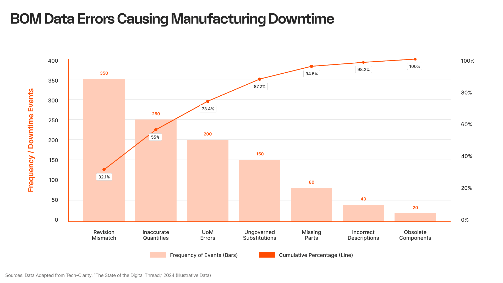 Tracking these metrics quickly reveals that the most severe shop floor disruptions are direct symptoms of relying on static, disconnected BOMs. When organizations fail to maintain a dynamic digital thread, data inevitably degrades across silos, and the consequences hit the assembly line immediately. The Pareto chart above illustrates the top drivers of BOM-related downtime. Addressing these requires a firm understanding of the root causes and applying strict, cross-functional system controls.