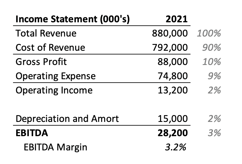 After a couple adjustments we see EBITDA (earnings before interest taxes and depreciation & amortization) of $28M at a 3.2% margin (EBITDA / Sales).