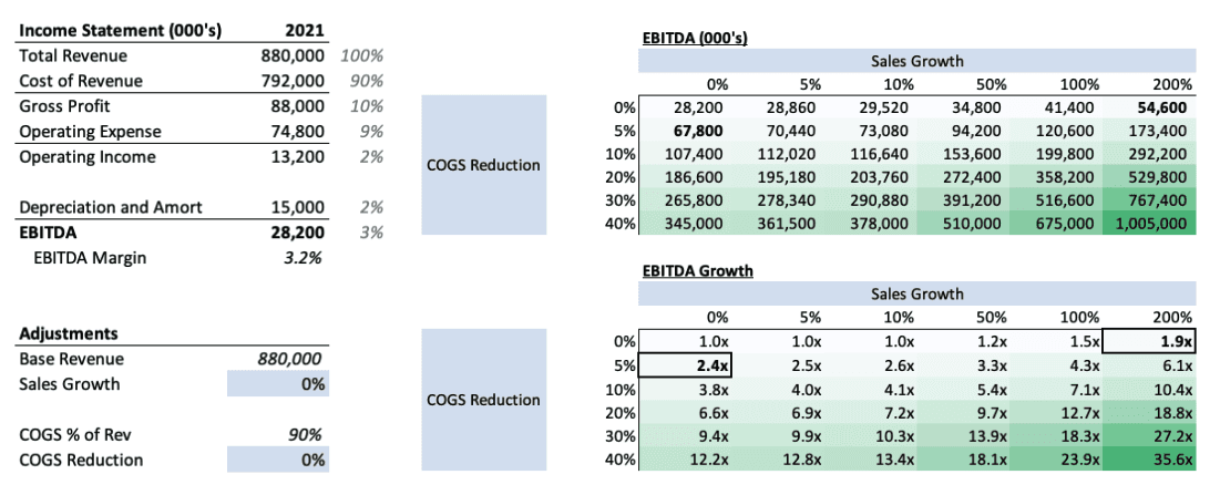 However, if reduce costs by even 5%, while holding sales constant, the EBITDA profits more than double by 2.4x.